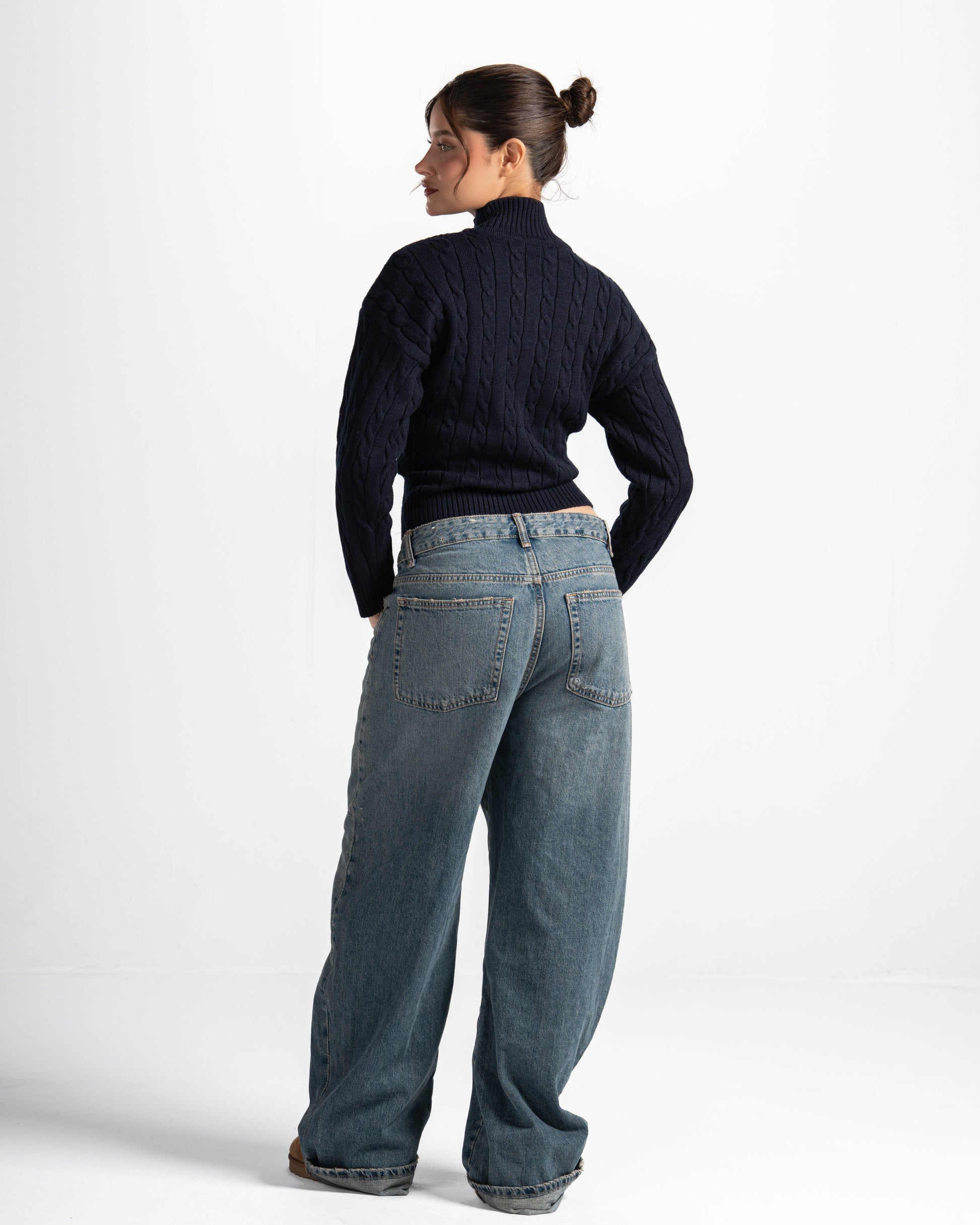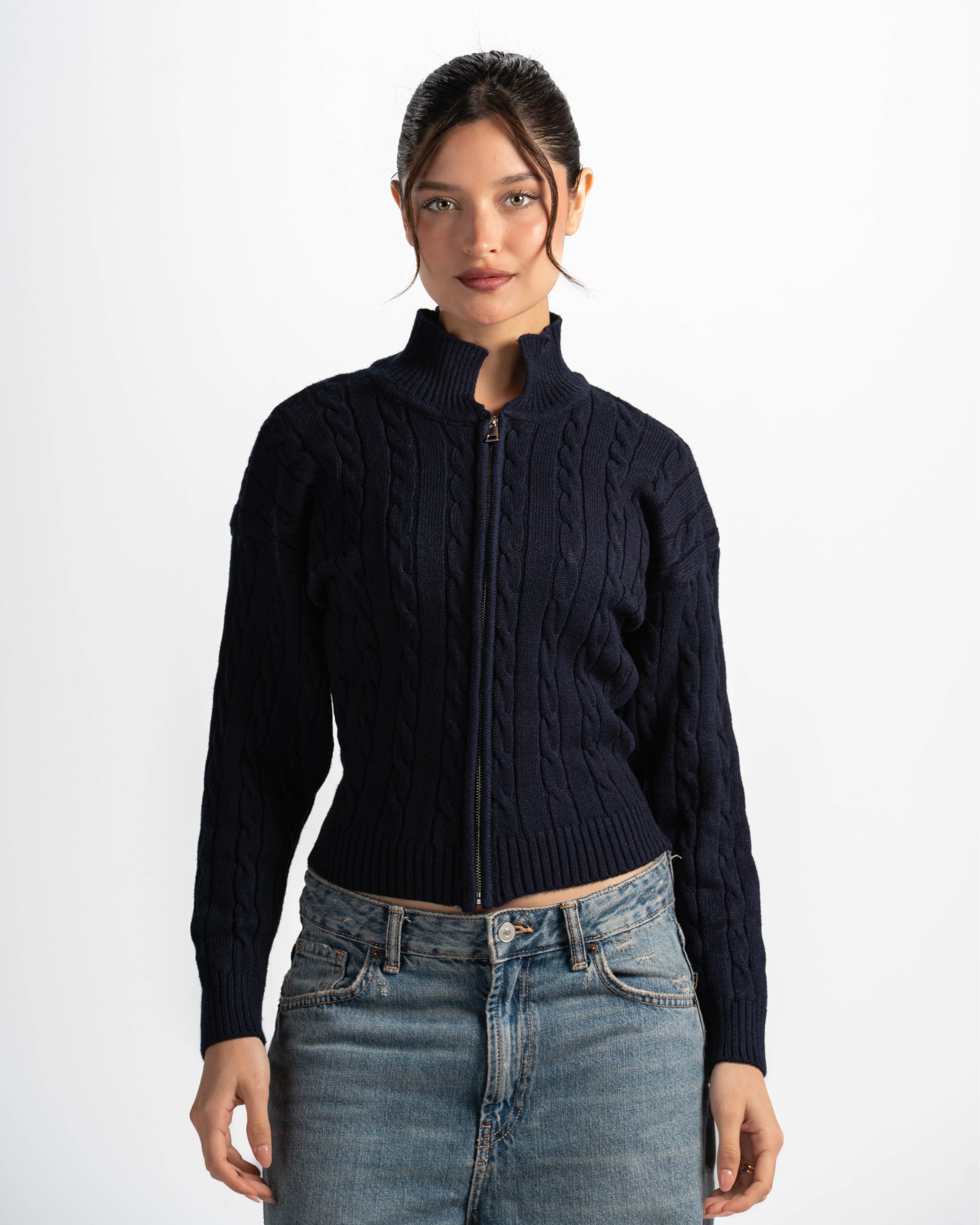 A classic cable-knit zip sweater with a high collar and cozy, structured feel—an everyday essential.